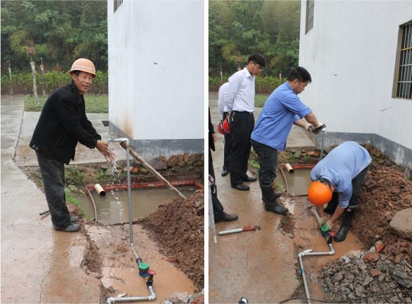 為盡快幫助村民解決用水問題,安裝小組冒雨前往。在安裝現(xiàn)場,我們看到有人在使用套絲機,有人在接水管,大伙忙的不亦樂乎。經(jīng)過2個小時的奮戰(zhàn),順利為其接通水源,安好水表,并裝好了水龍頭。當(dāng)現(xiàn)場看到水龍頭流出水的那瞬間,大家的心情都非常激動,費某的臉上更露出了久違的笑容,欣喜的用手接起了新家的“第一股清泉”。